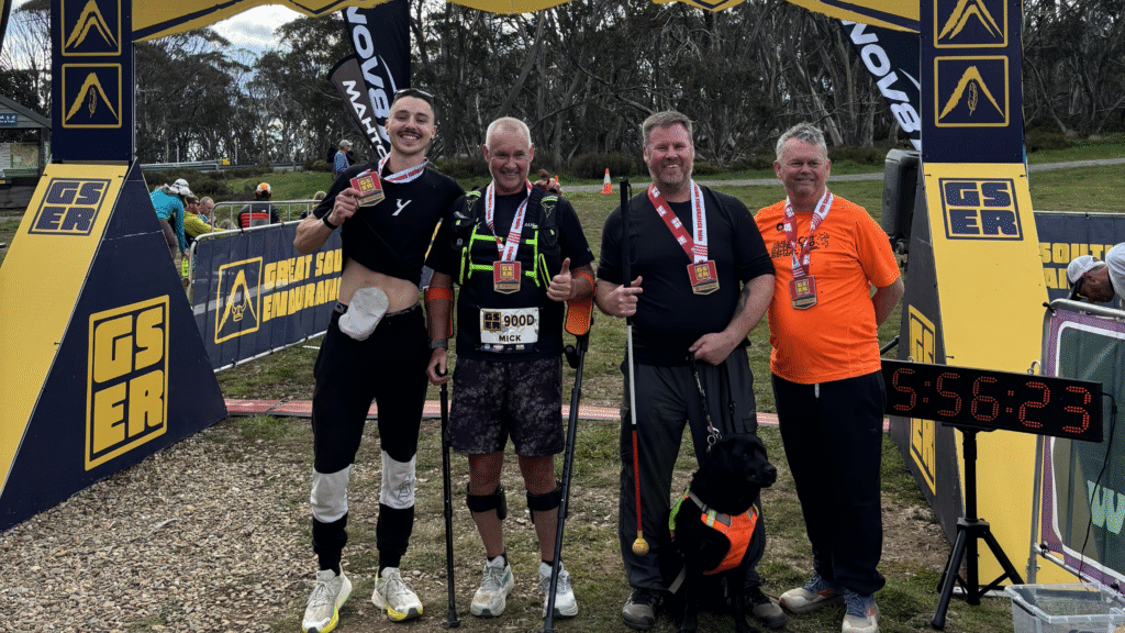 I went on to achieve a huge highlight, the Great Southern Endurance Run in Mount Hotham. I was invited by Mick Marshall, who has a bilateral lower limb and neurological (CRPS) disability and has been relearning to walk after shattering his legs in a fall. He now races with crutches. He built a relay team to be the first adaptive team to finish it, with myself and Dale Pierce, who’s blind and did his eight kilometres with no guide, just a cane. We went on to become the first-ever adaptive athlete team to complete the Great Southern Endurance Run.